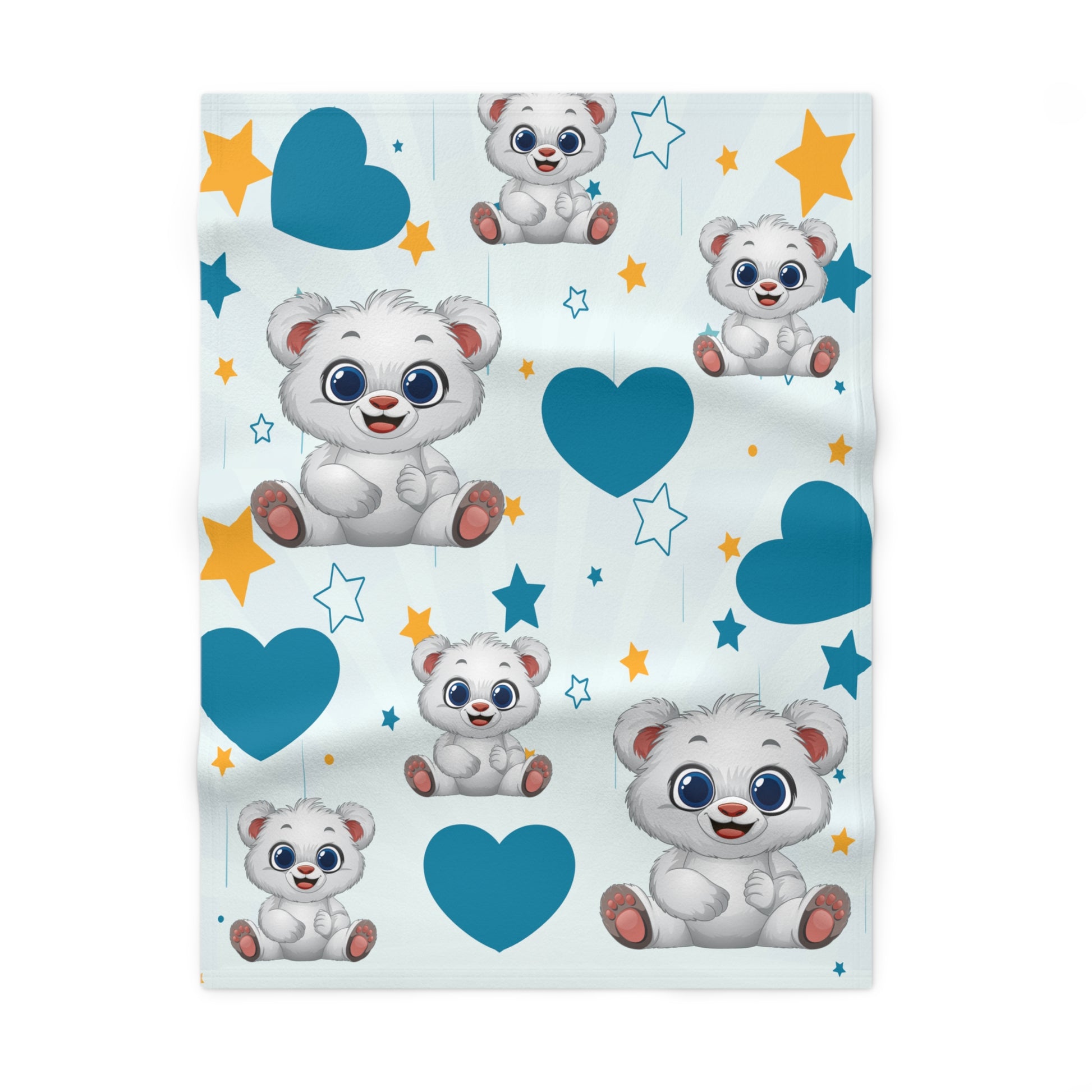 Wrap your little one in soft, cozy comfort with the Baby Bear Heart Fleece Blanket — a perfect choice for nurseries and newborn gifts. Its cheerful polar-bear cubs, teal hearts, and pale blue background create a calm, inviting nap-time and cuddle-ready space.