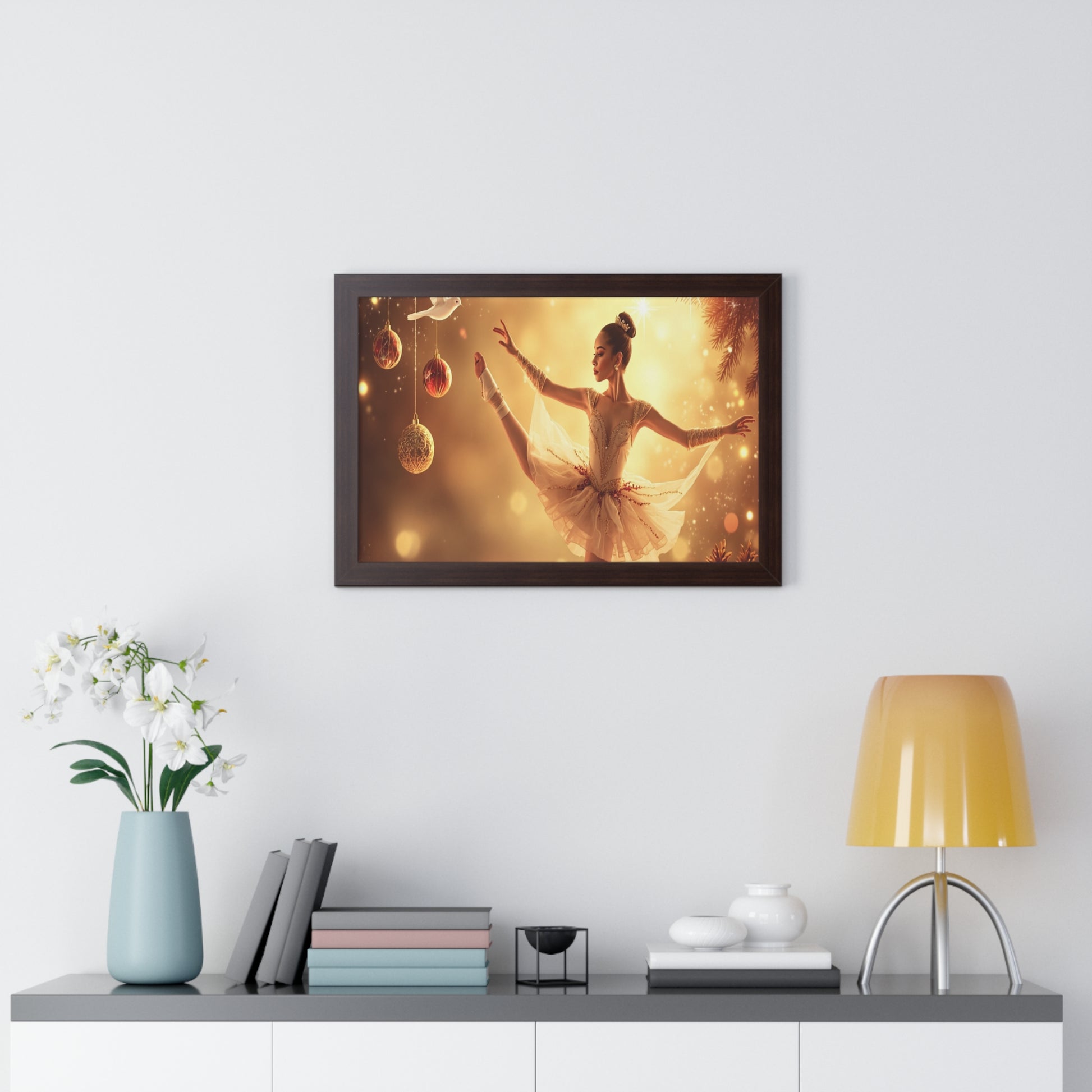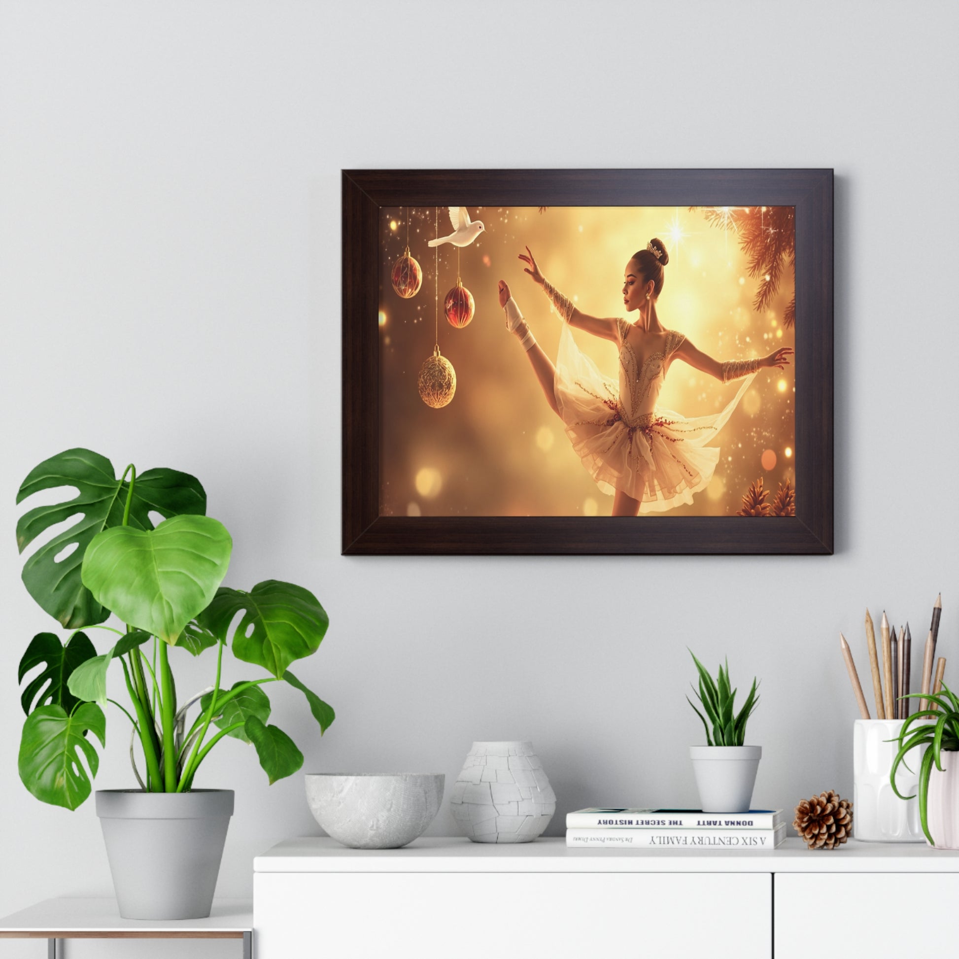 Warm light pools across a graceful moment — a ballerina surrounded by a holiday glow. Printed on museum-grade paper and framed in a slim MDF frame. This framed horizontal poster brings quiet movement and golden warmth to entryways, living rooms, or a cozy practice corner. The matte finish and pigment inks preserve rich, luminous tones without glare, while the protective acrylic cover and pre-installed hanging hardware mean this piece arrives ready to hang and enjoy.