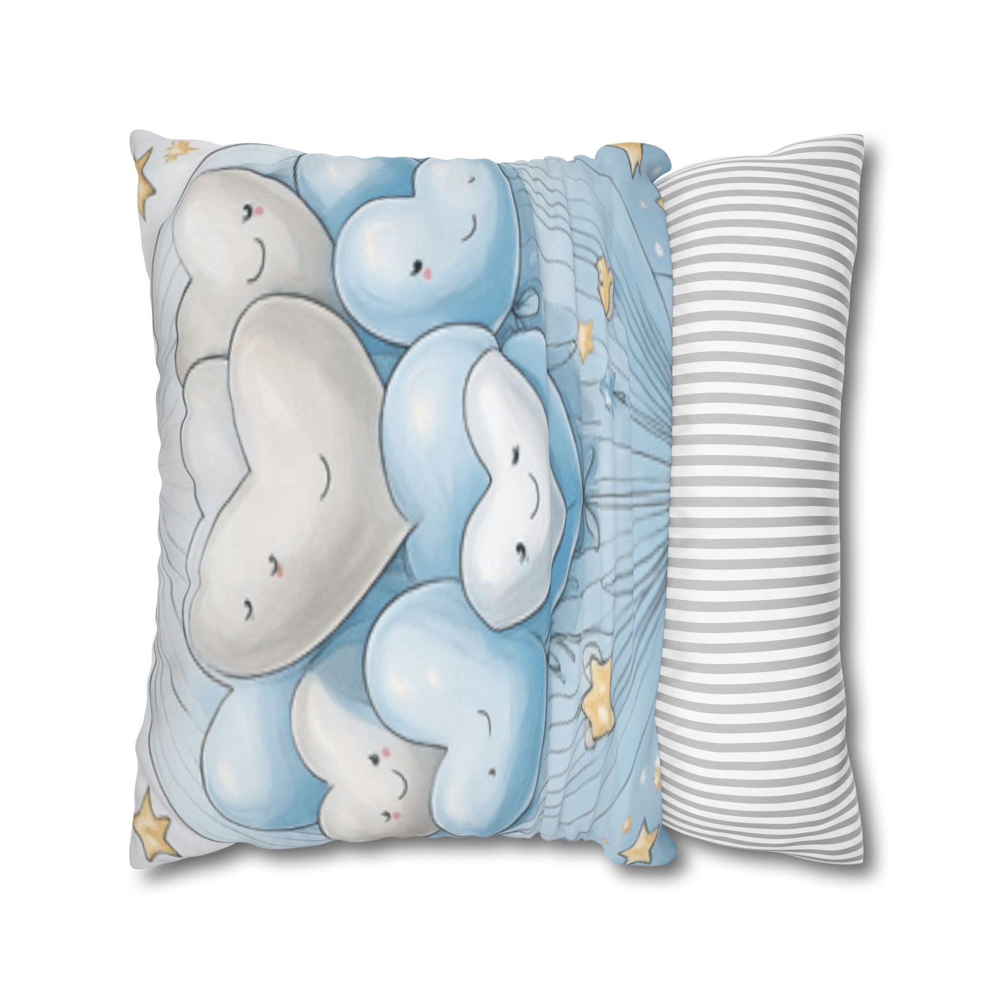 Soft, dreamy, and quietly cheerful — this square poly canvas pillowcase brings a gentle, bedtime-story mood to any cozy corner. Plush heart-shaped clouds float across a pale-blue sky, their sleepy faces and tiny golden stars creating a scene that soothes and comforts. The fine-weave polyester canvas feels soft to the touch, and the double-sided print keeps the artwork visible from every angle. A discreet zipper keeps the cover neat while letting you change inserts as seasons or décor shift. Let it rest on a nursery rocker, a reading nook, or a guest bed to add a touch of calm and childlike wonder.