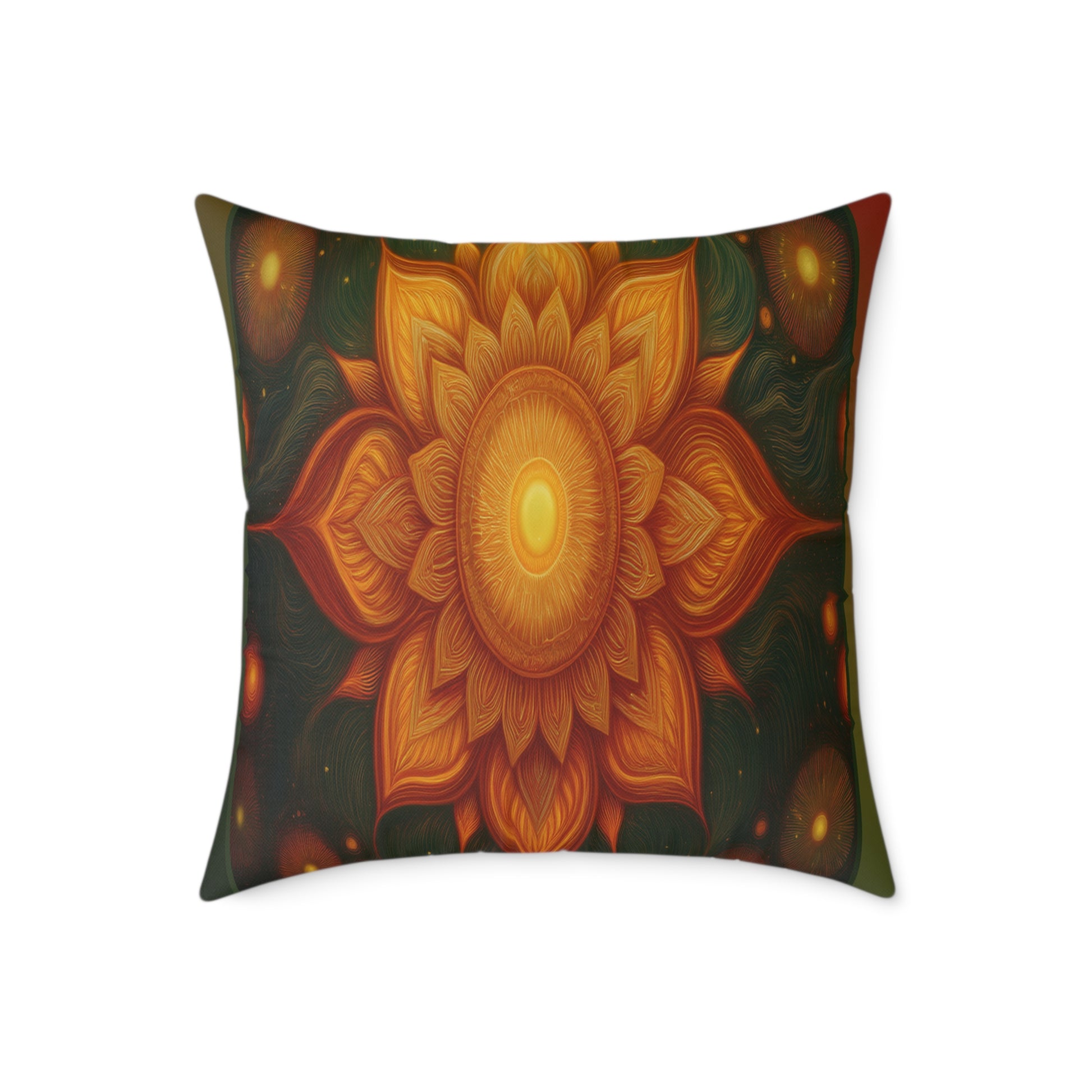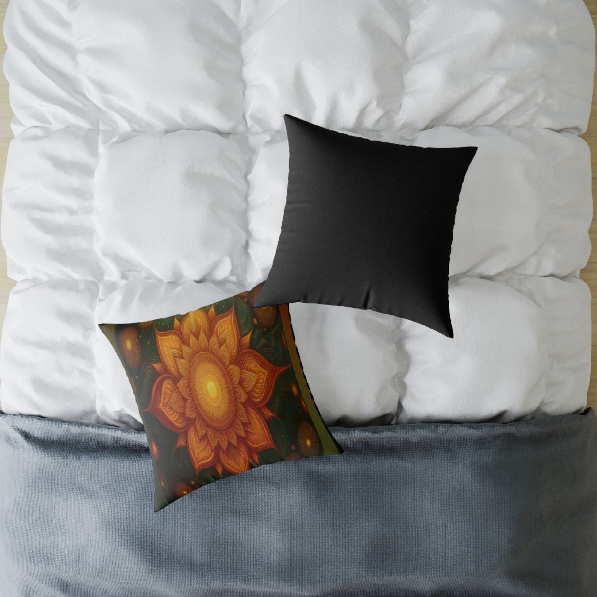 richly colored square poly canvas pillow that brings a warm, hand-crafted feel to any room. The front showcases a radiant, mandala-like floral design in deep oranges and golds that seems to glow from the center, while the reverse is a solid, grounding black. The fabric has a fine weave with a soft hand and a reassuringly sturdy fill that holds shape whether used on the floor, sofa, or bed. Thoughtfully finished with a concealed zipper and vibrant double-sided printing, it’s made to brighten cozy corners, complement bohemian and rustic decor, and anchor moments of calm and conversation.