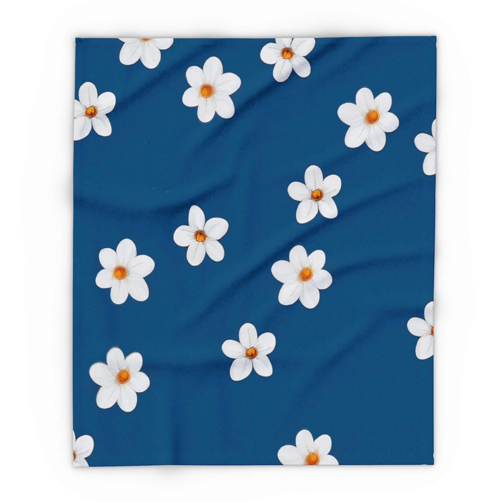 Wrap yourself in a quiet, joyful calm. This warm fleece blanket carries a handful of simple white blossoms scattered across a deep, comforting blue — like a late-summer sky brushed with small, friendly flowers. Lightweight but plush, it settles over shoulders and laps without weighty heat, offering a soft, tactile pause during early-morning coffee, an evening read, or a slow weekend at home. The hemmed edges hold their shape wash after wash, and the bright print keeps its clarity so the floral pattern stays fresh and cheery. For someone who likes understated, cozy accents and gentle color, this blanket feels like a small daily ritual — a familiar, cheerful layer that turns ordinary moments into ones worth lingering over. Also available in Pink.