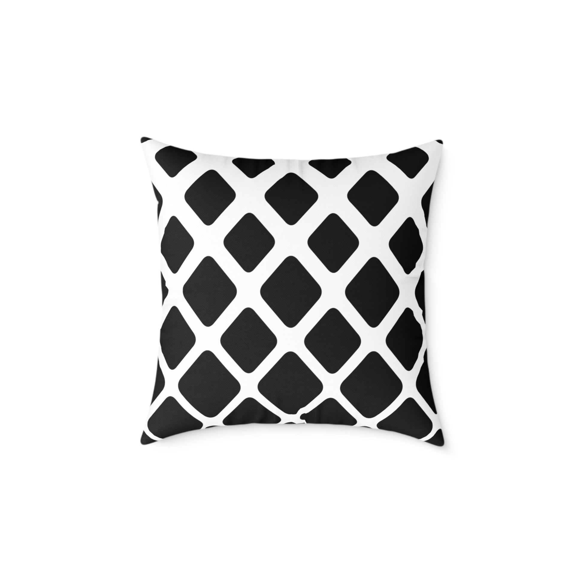 Soft, sculpted, and quietly graphic — this square poly canvas pillow brings modern contrast to living rooms, reading nooks, and cozy floor corners. The bold black-and-white lattice print reads like contemporary textile art, settling into minimalist, Scandinavian, or boho-modern spaces. It feels firm enough to support a lazy afternoon on the floor, yet smooth and gentle against skin thanks to the fine-weave polyester canvas and foamed lining. The double-sided print keeps the pattern consistent from every angle, and the concealed zipper keeps the silhouette clean.