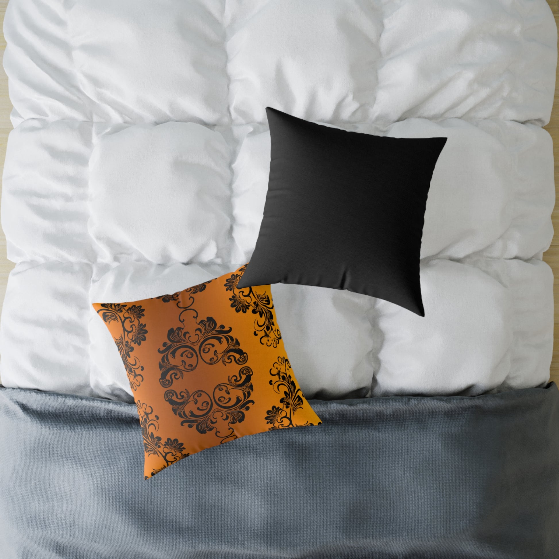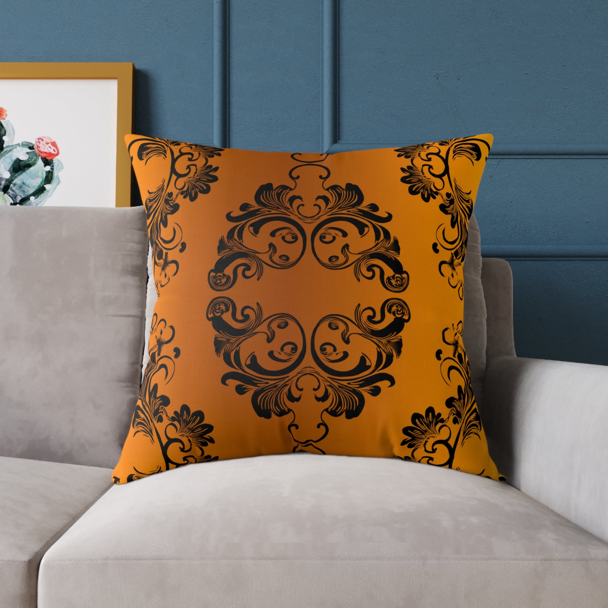 Warm, ornate, and quietly bold — this square poly canvas pillow brings a touch of vintage charm to a modern room. The rich amber background and matte-black damask motif feel like the glow of candlelight in an old parlor. It sits low and supportive on the floor or anchors a sofa arrangement, lending texture and an old-world mood without feeling fussy. The double-sided print keeps the pattern consistent from every angle, and the concealed zipper keeps lines clean while letting you remove the cover when you want to refresh the look. Choose from five sizes to find the right scale for a reading nook, a lounge corner, or layered on a bed. It holds its shape, dries quickly, and keeps colors bright through daily use — a quietly resilient accent that settles into a lived-in home.