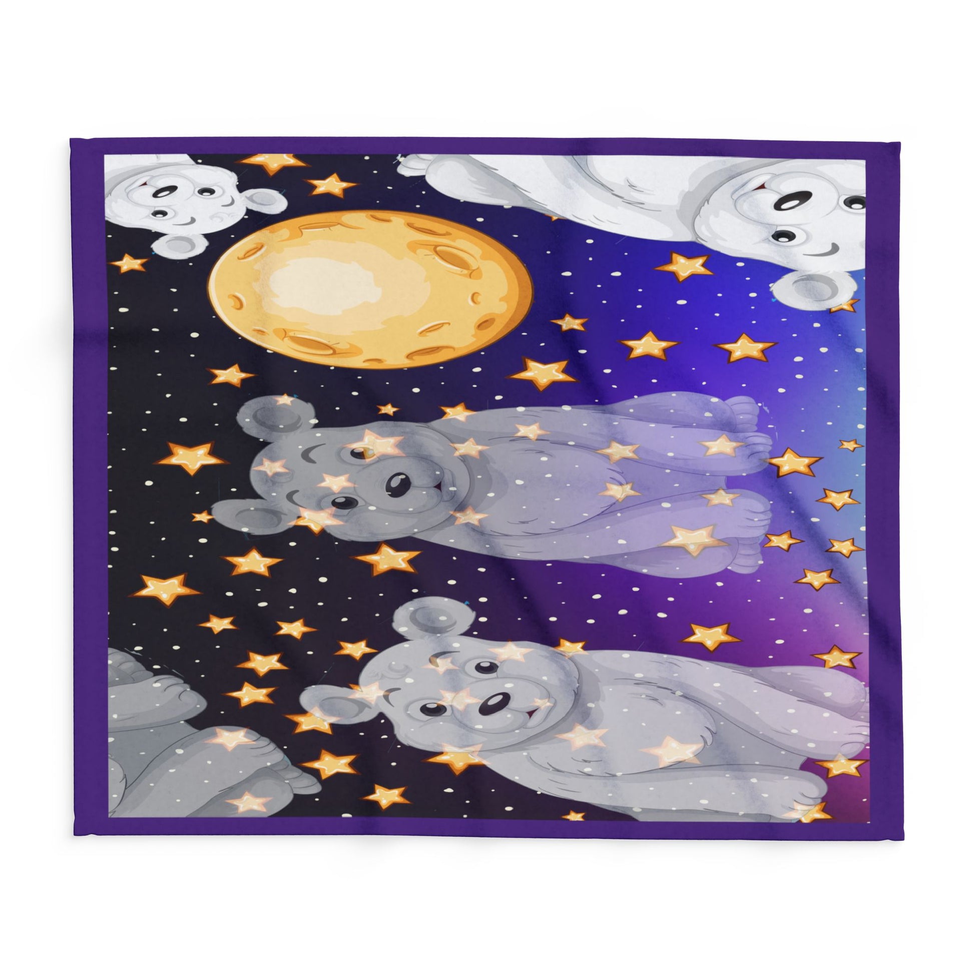 A cozy, star-filled throw that brings bedtime wonder to quiet nights. Soft, thick fleece wraps you in warmth while playful polar bears float among golden stars and a warm moon on a deep violet sky. Lightweight enough to drape over a couch or tuck around little legs, this blanket turns an ordinary evening into a gentle, moonlit escape. Let it live on the nursery chair, layered across a reading nook, or folded at the end of a bed — it invites calm, cuddles, and a touch of whimsical night-sky magic.