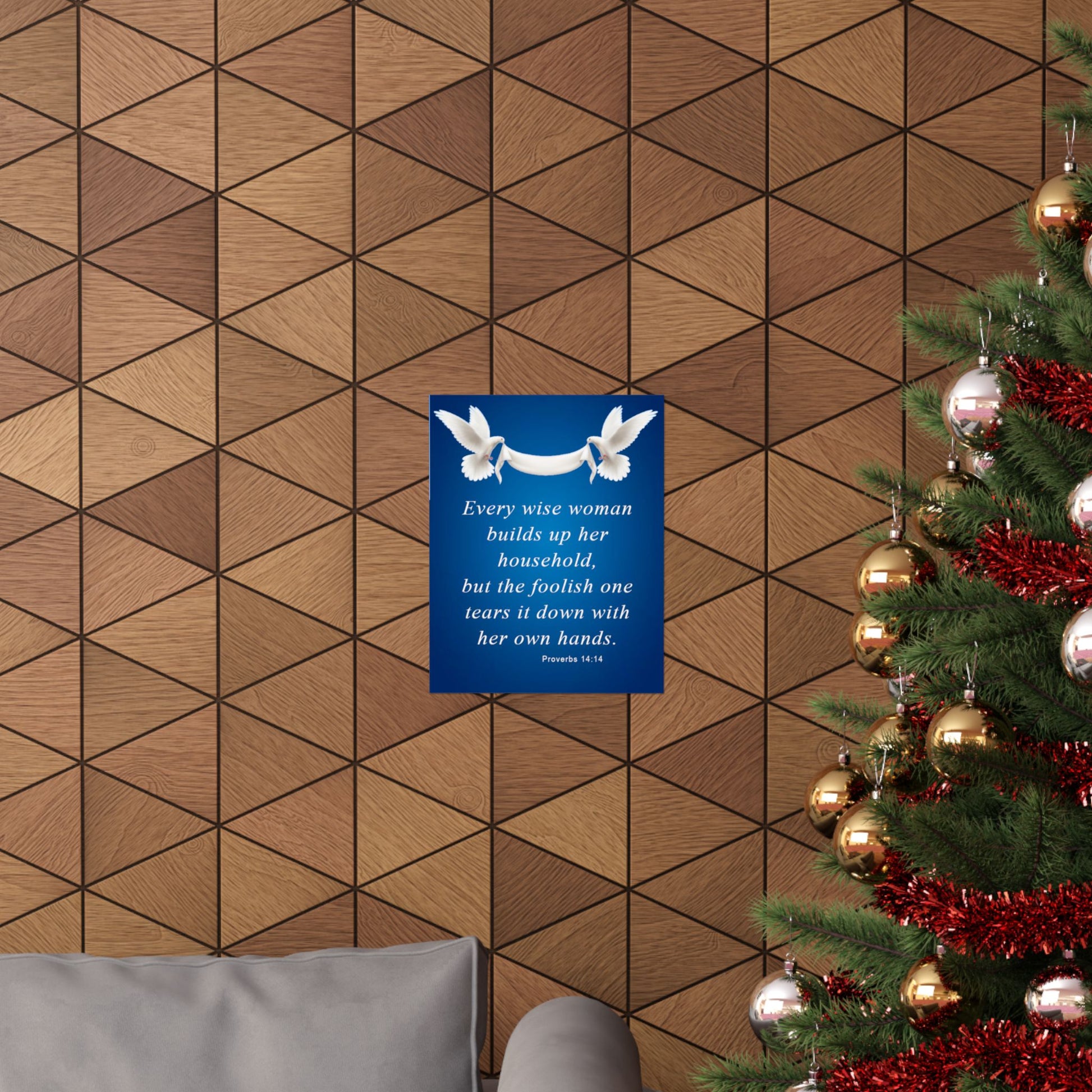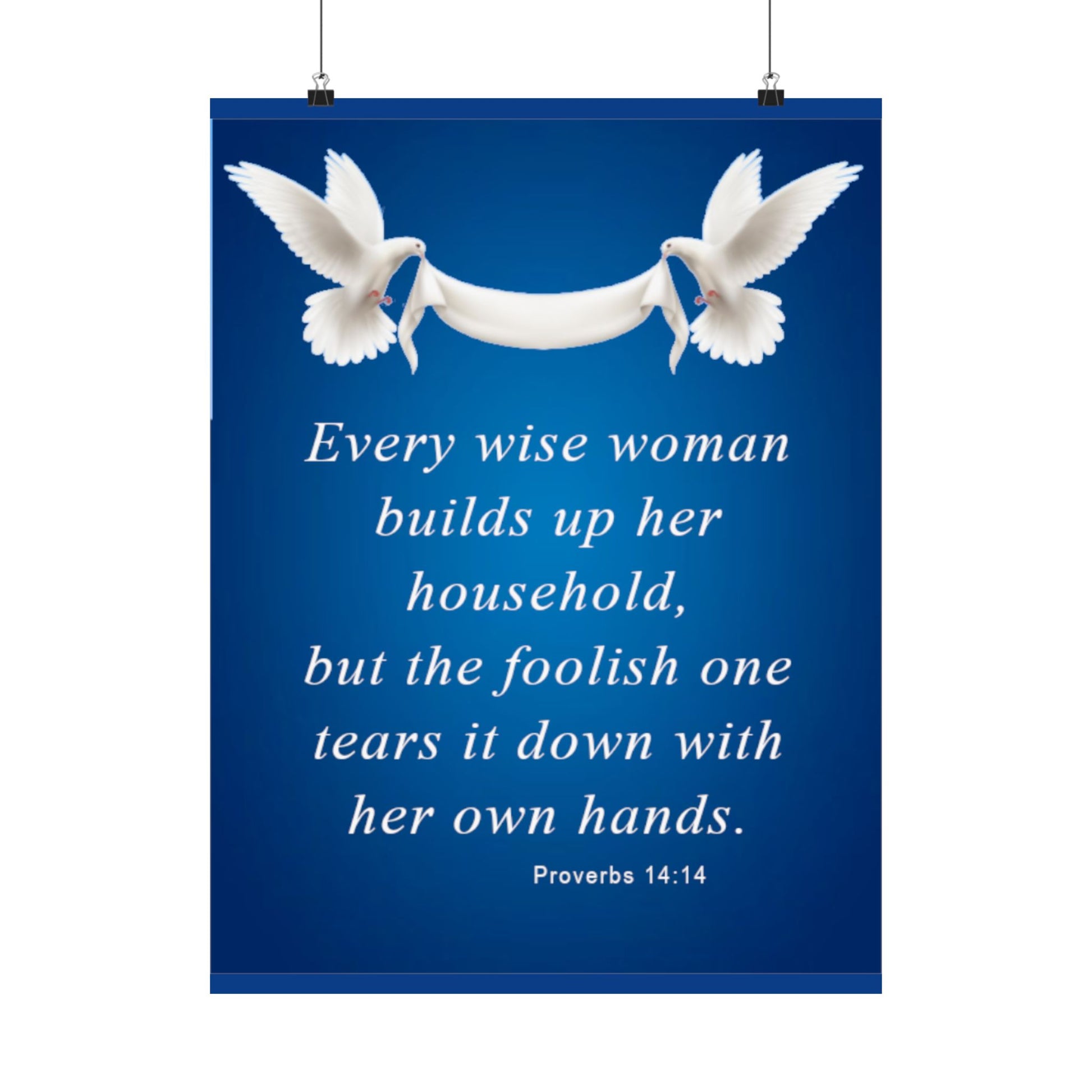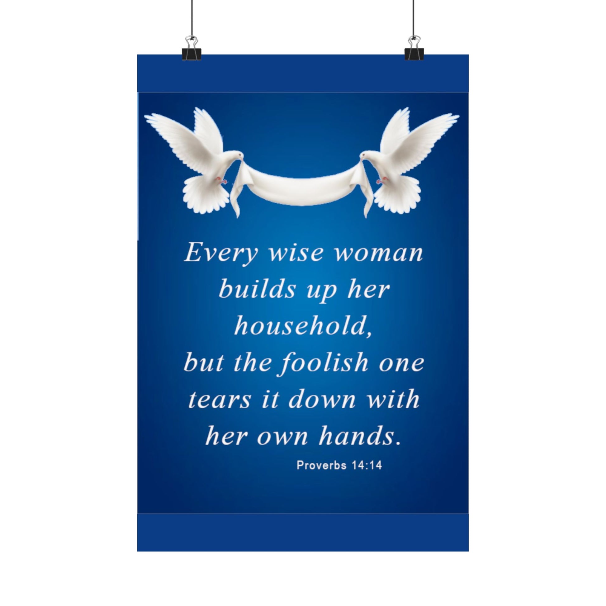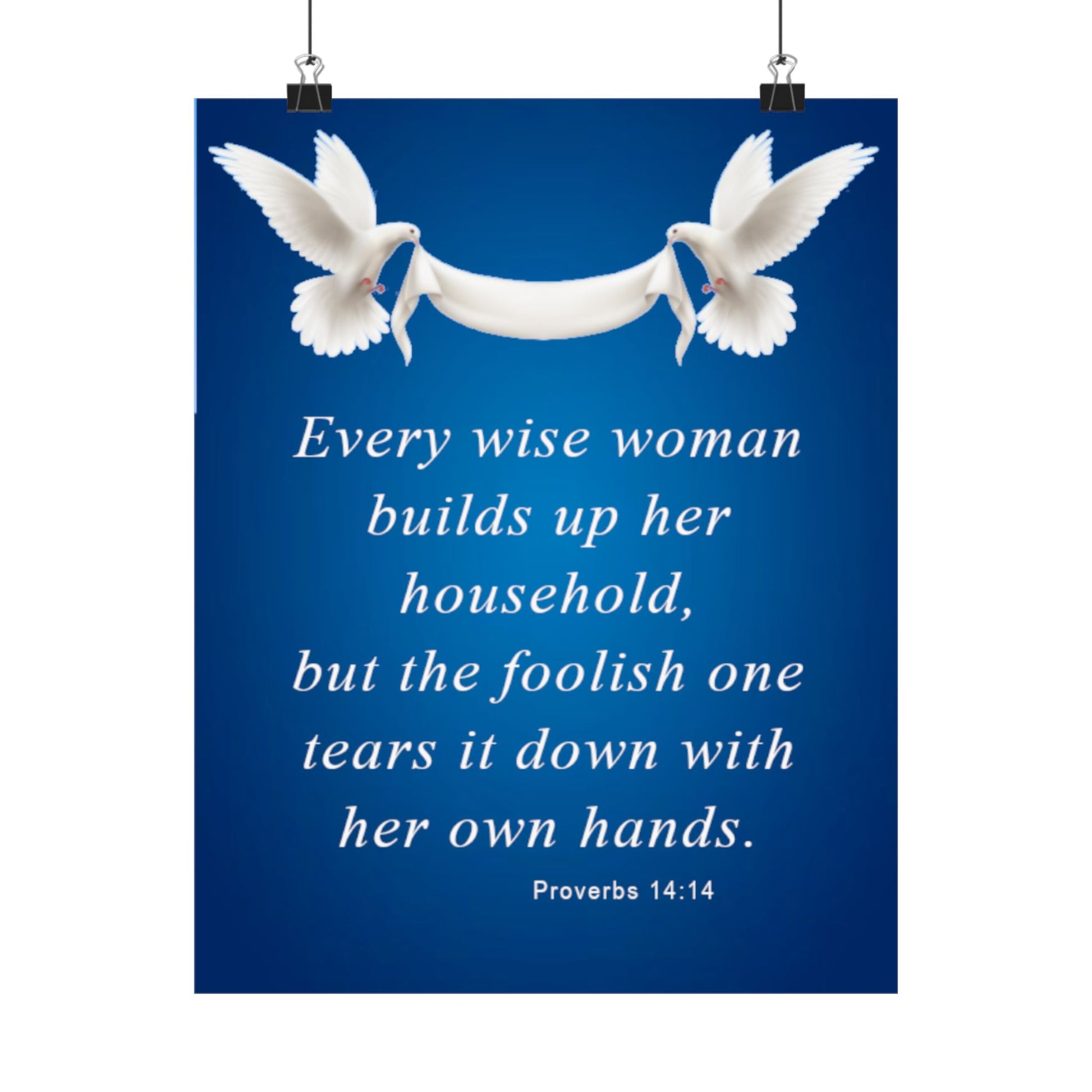 A calming, faith-centered matte poster that brings a quiet reminder into the places you live and gather. Soft white doves carry a flowing banner above an elegant set of serif words Proverbs 14:14 set against a deep, luminous blue. The museum-grade archival paper and Giclée printing keep the blues rich and the type crisply defined, so the message remains warm and readable for years. Hung in a hallway, living room, or prayer corner, this poster reads like a gentle nudge toward wisdom and steady hands in daily life.