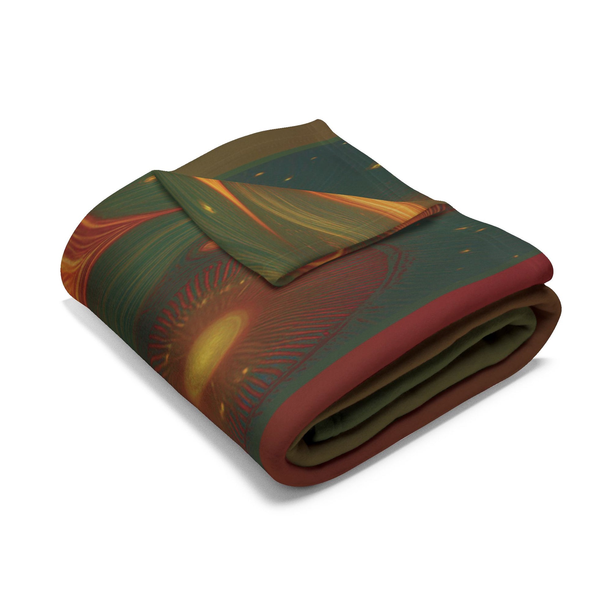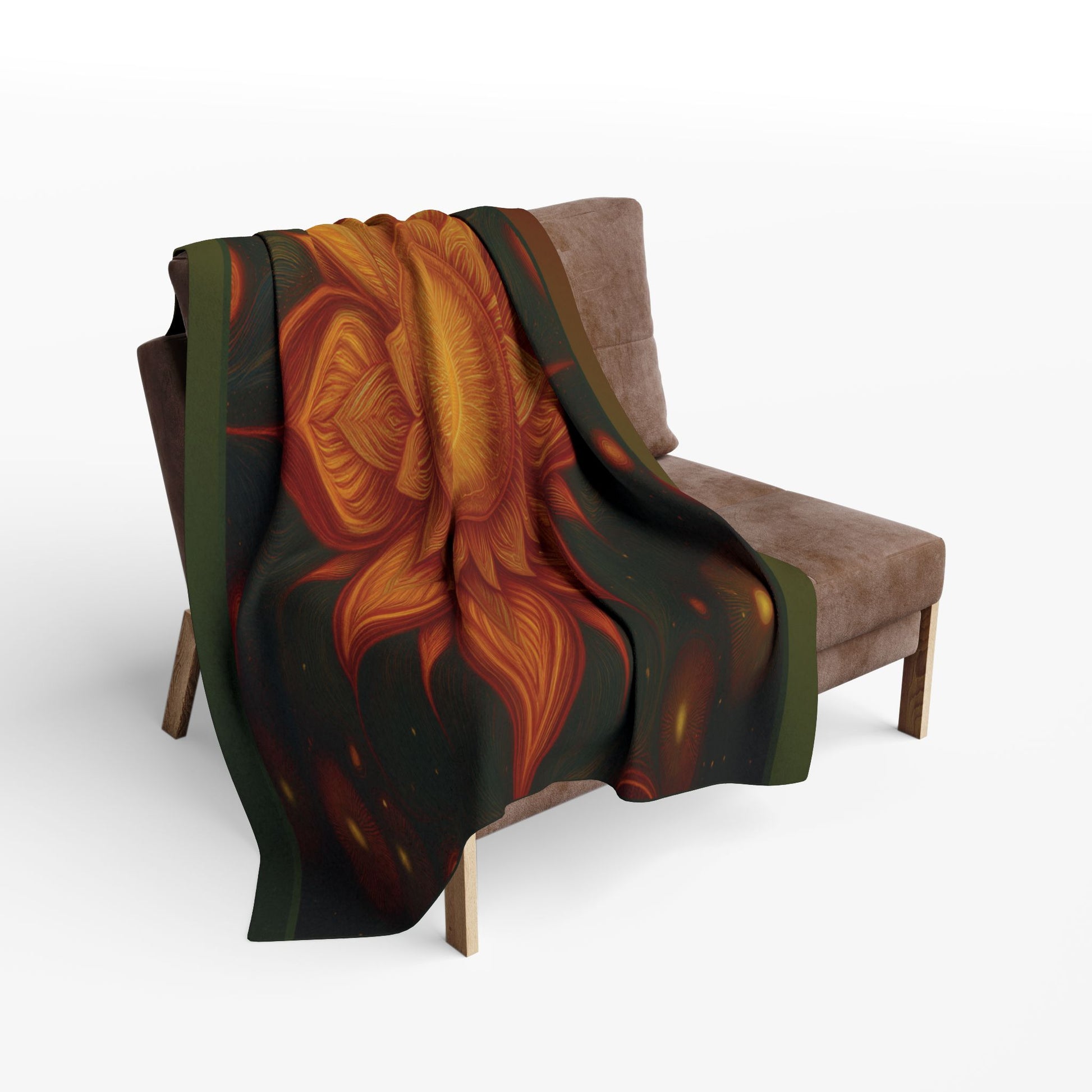 This plush fleece blanket wraps you in warm, meditative calm. Deep, earthy greens and glowing amber petals radiate from a central lotus-like motif, evoking quiet evenings, candlelight, and slow breaths. The thick, double-sided plush feels like a gentle hug across the shoulders while the vivid printing keeps the mandala’s colors rich and luminous. Drape it over a favorite chair, lay it across a bed for layered warmth, or bring it to a ceremony or grounding session to anchor the space in warmth and color. Warm Boho Floral Throw for Meditation & Home Décor